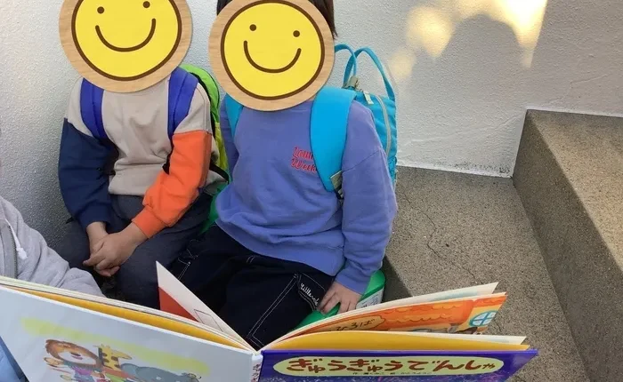 今日はお友達と一緒にお外で読み聞かせをしながら、